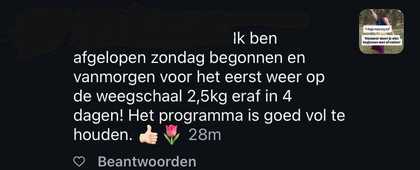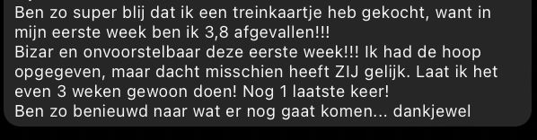 Ik had de hoop opgegeven, maar dacht misschien heeft ZIJ gelijk. Ben zo super blij dat ik een treinkaartje heb gekocht, want in mijn eerste week ben ik 3,8 afgevallen!!! Bizar en onvoorstelbaar deze eerste week!!! Ik had de hoop opgegeven, maar dacht misschien heeft ZIJ gelijk. Laat ik het even 3 weken gewoon doen! Nog 1 laatste keer! Ben zo benieuwd naar wat er nog gaat komen… dankjewel