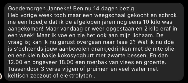 Goedemorgen Janneke! Ben nu 14 dagen bezig. Heb vorige week toch maar een weegschaal gekocht en schrok me een hoedje dat ik de afgelopen jaren nog eens 10 kilo was aangekomen! Maar vandaag er weer opgestaan en 2 kilo eraf in een week! Maar ik voe en zie het ook aan mijn lichaam. De vraag is; kan ik nu gerust overgaan naar fase 2?