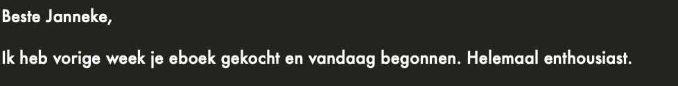Ik vond het echt een uitgebreide training. Ik heb nog niet eens alle video’s bekeken. Ik vond de laatste les heel waardevol, hoe een perfecte dag er uit kan zien. En je stappenplan is ook heel fijn, dat je dat ook elke keer herhaalde. A.